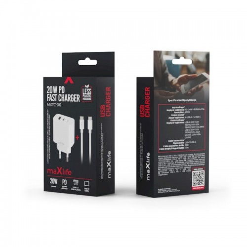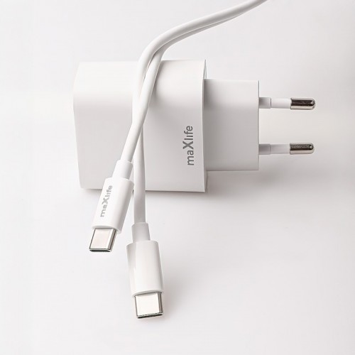 Maxlife φορτιστής MXTC-06-20AC PD QC 1x USB-C 1x USB 20W λευκό + USB-C - καλώδιο USB-C 20W